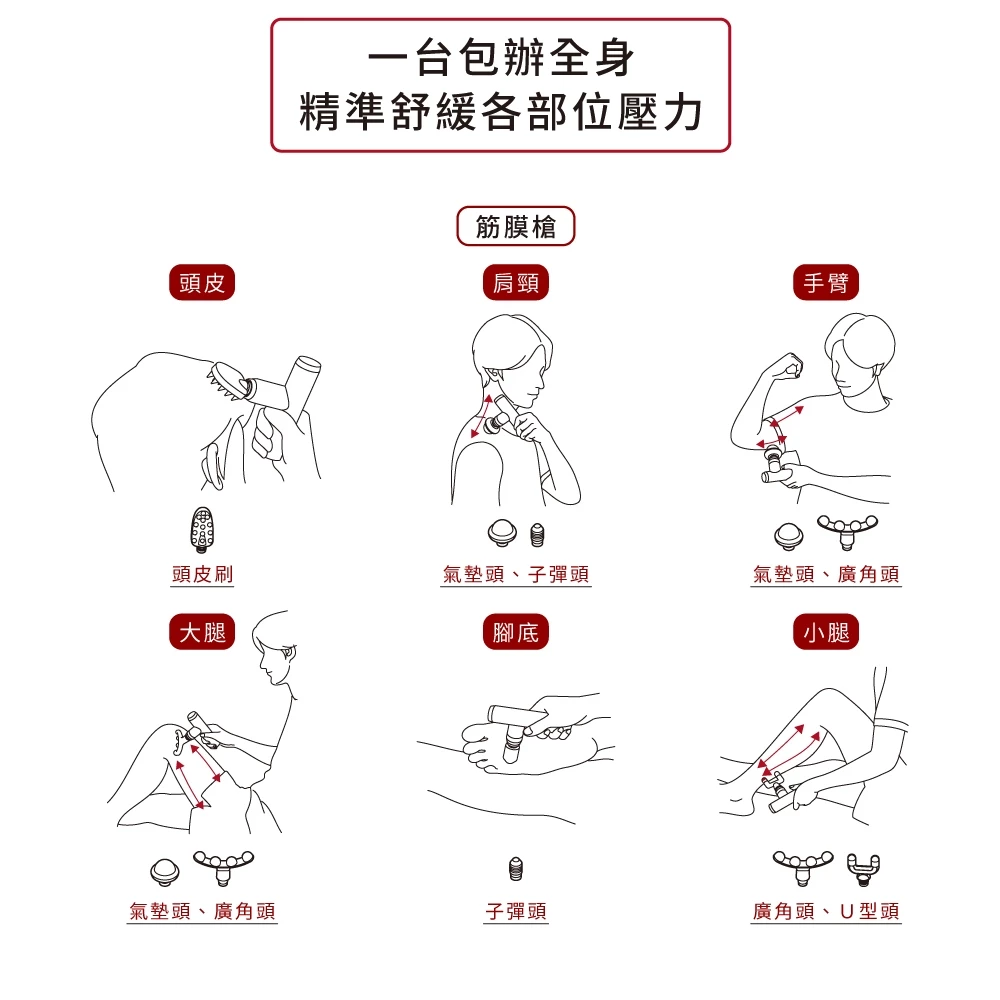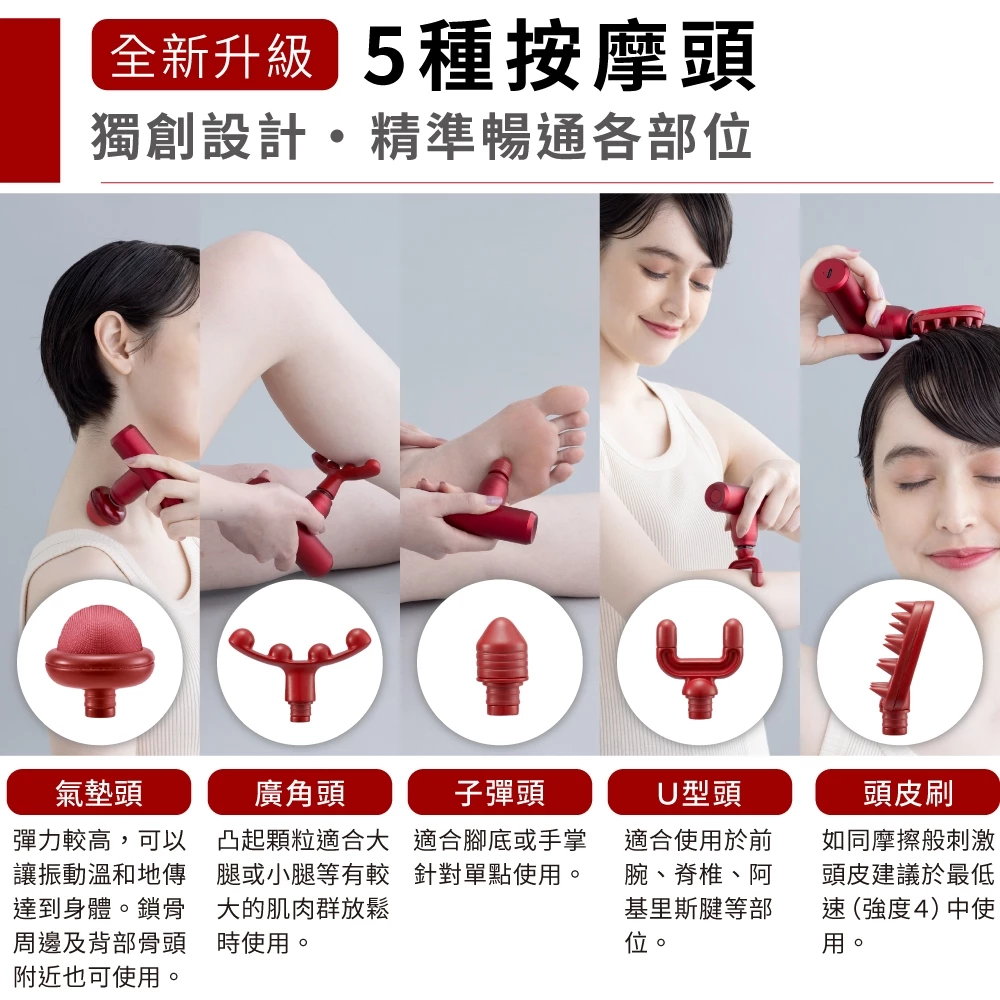 ●5種按摩頭|獨家氣墊頭吸震高彈,獨家頭皮矽膠刷溫和軟化頭皮